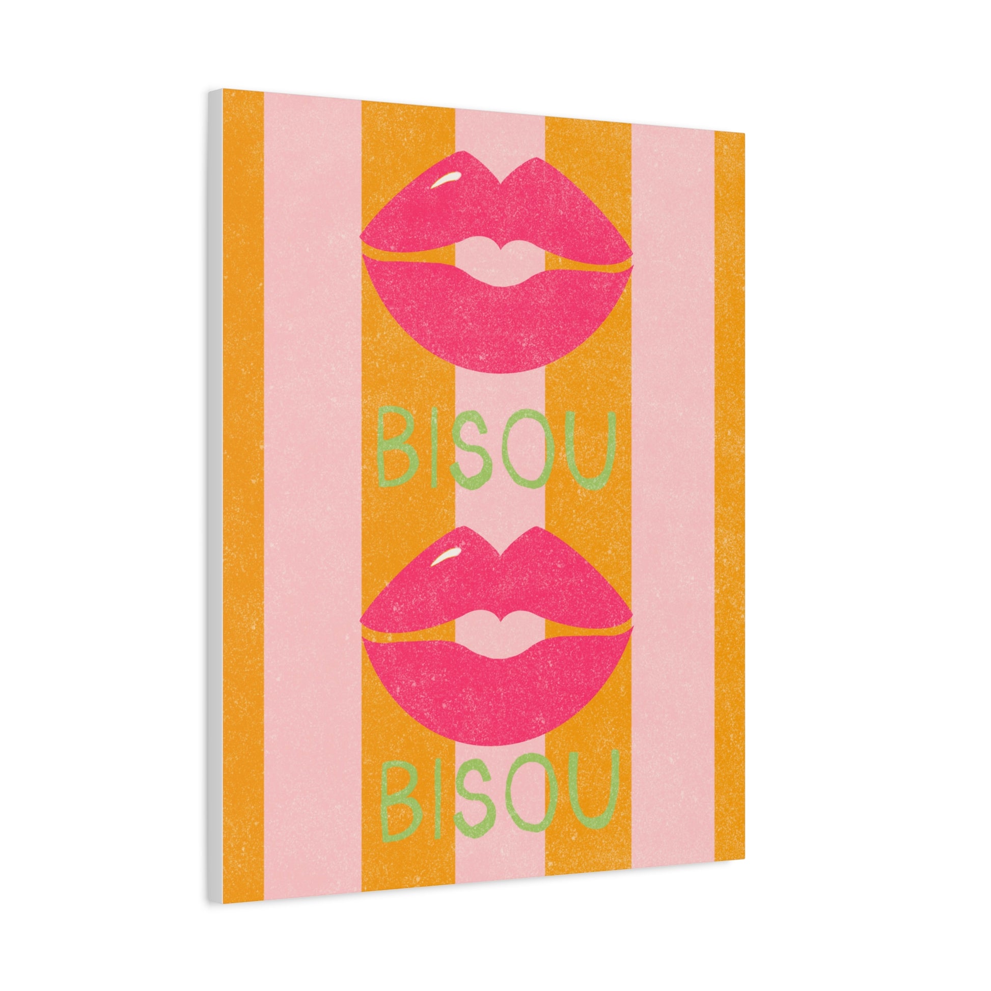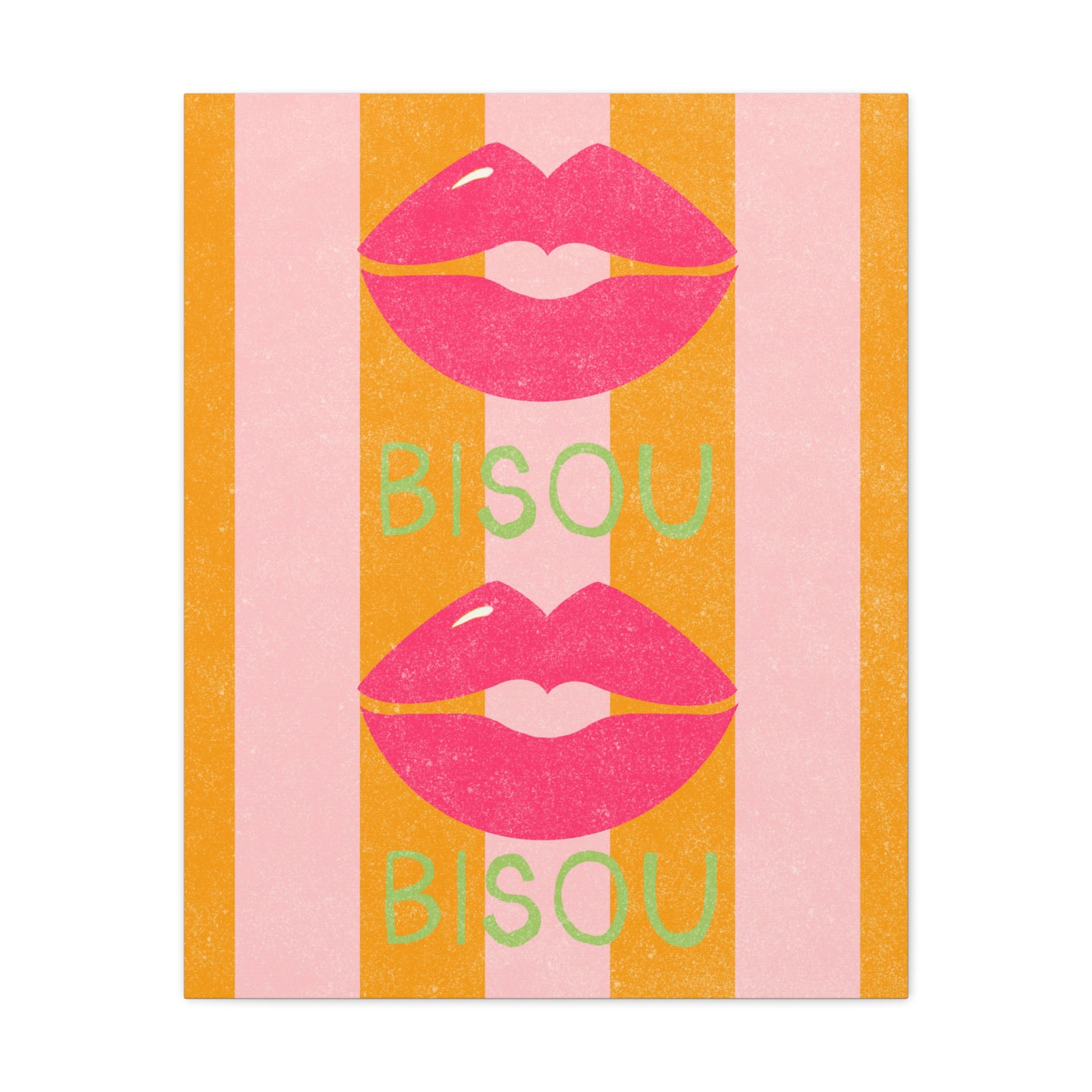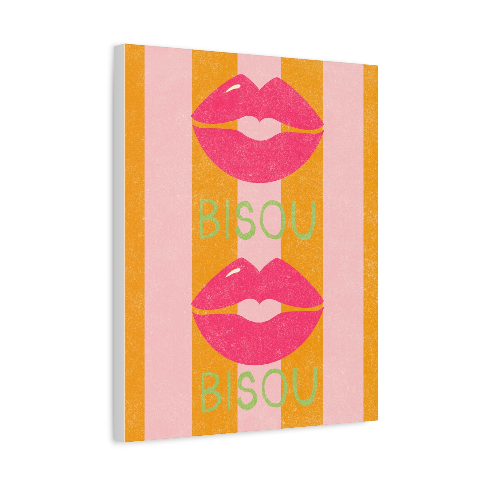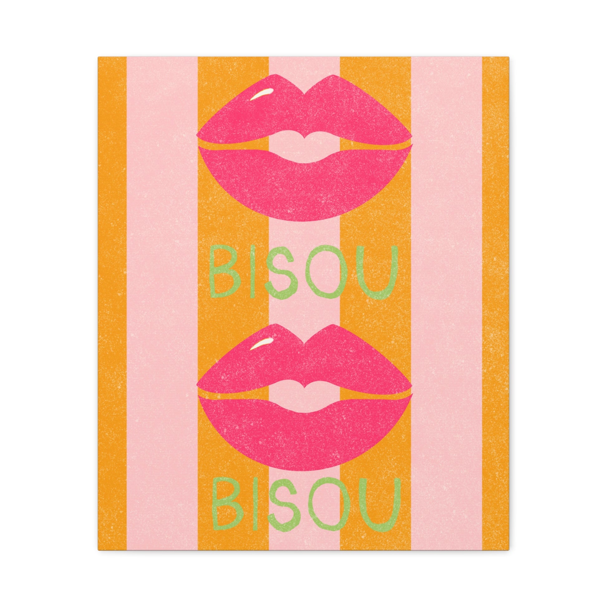 Add a touch of romance to your home decor with this bold and vibrant canvas featuring a french kiss or "Bisou" over pink and orange stripes. Perfect for those who love unique and eye-catching art pieces, this canvas will make a statement in any room. Ideal for Valentine's Day, anniversaries, or any romantic occasion.