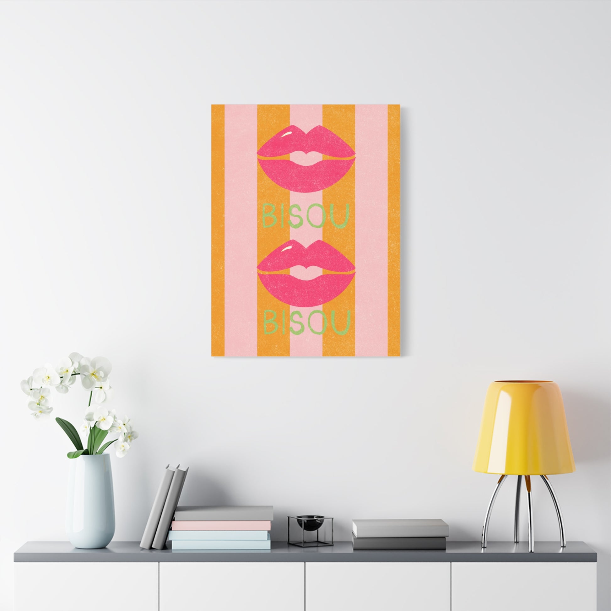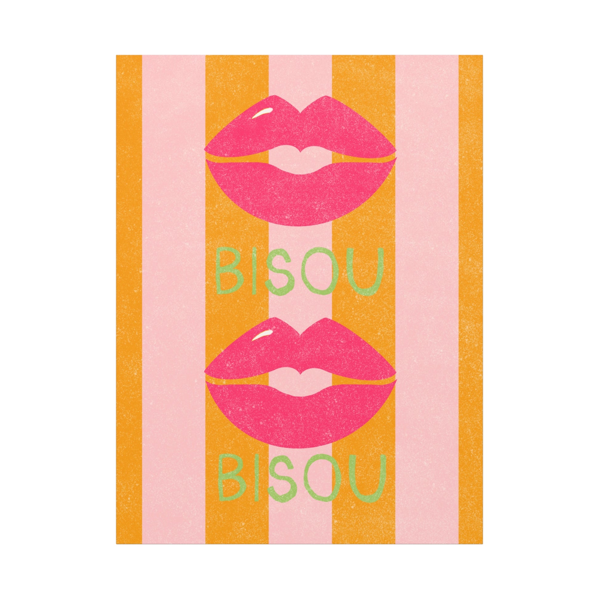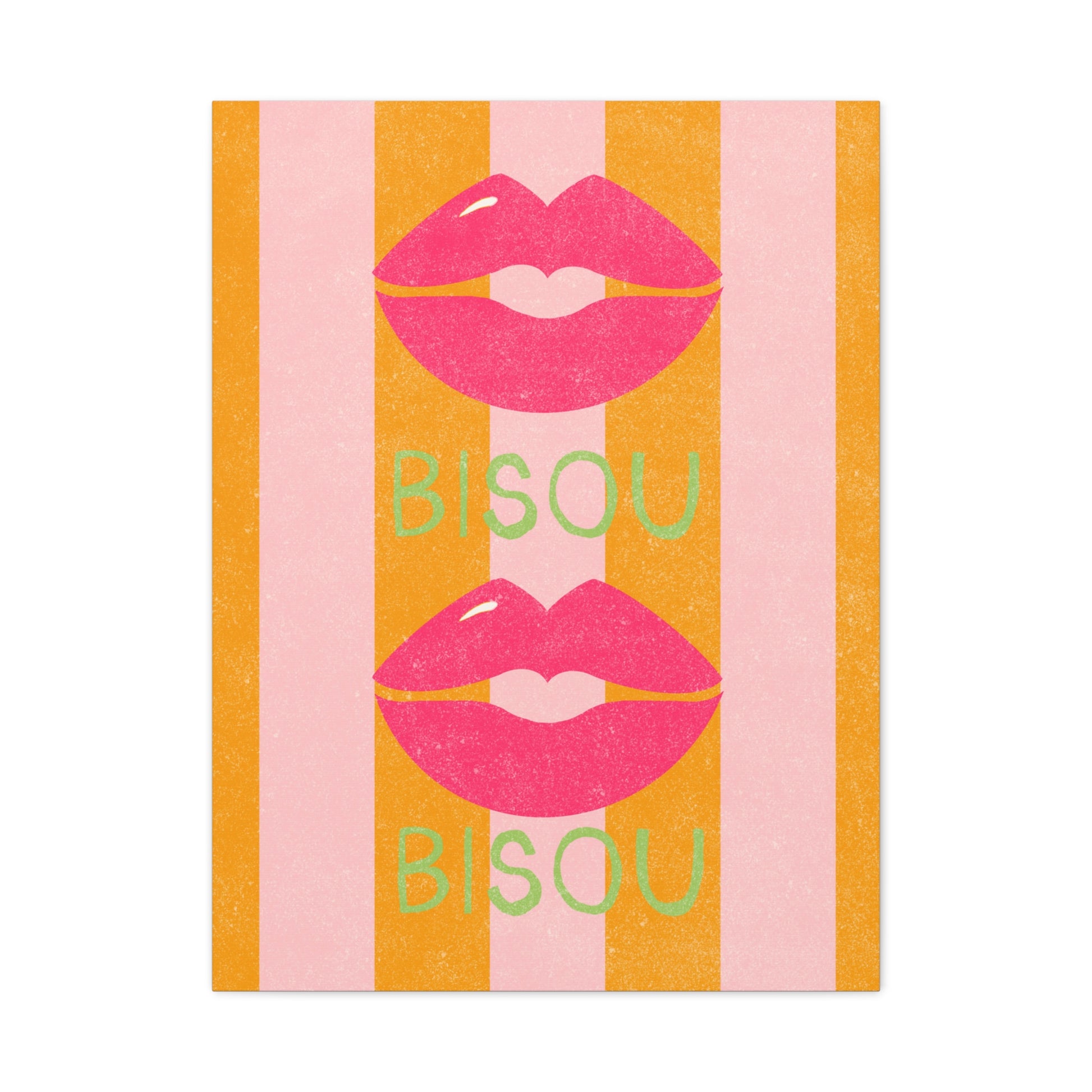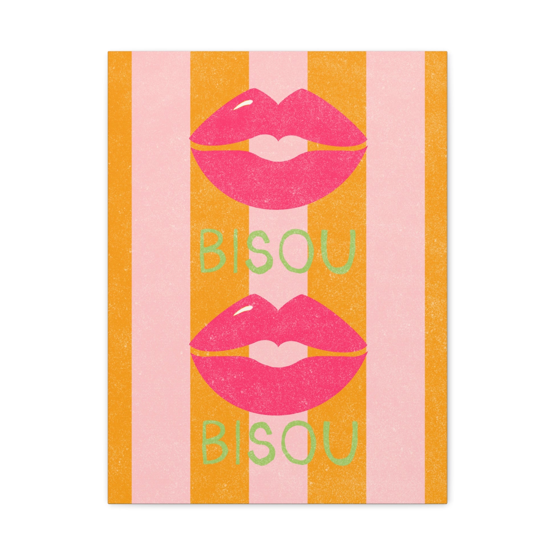 Add a touch of romance to your home decor with this bold and vibrant canvas featuring a french kiss or "Bisou" over pink and orange stripes. Perfect for those who love unique and eye-catching art pieces, this canvas will make a statement in any room. Ideal for Valentine's Day, anniversaries, or any romantic occasion.