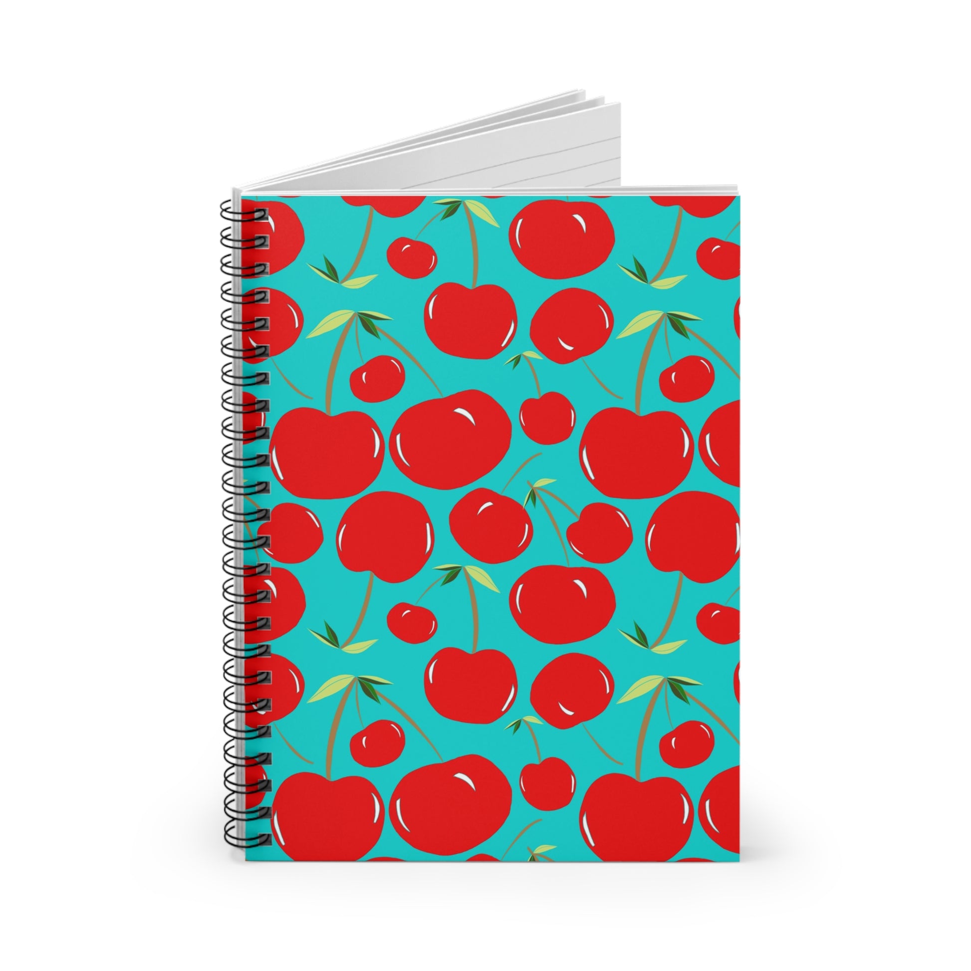 A stylish Spiral Notebook with bold cherries on bright cyan design, perfect for adding a pop of color to your desk. Ideal for students, writers, and cherry lovers, this notebook is relevant for back-to-school season, Valentine's Day, and birthdays.